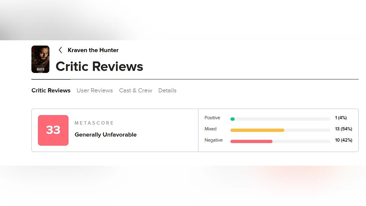 В мережі з'явилися перші огляди кінокоміксу «Крейвен-мисливець», в якому головну роль виконує Аарон Тейлор-Джонсон (Aaron Taylor-Johnson). Середня оцінка на Metacritic на момент написання новини складає 33 бали.