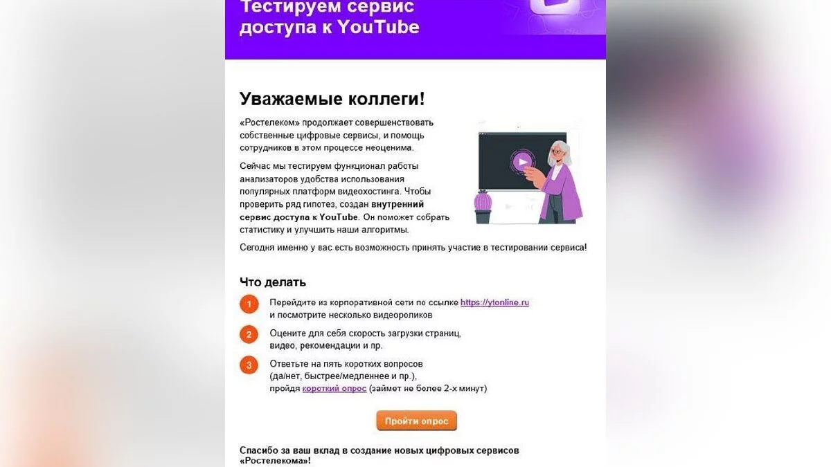 Компания «Ростелеком» начала внутреннее тестирование ytonline, некого «сервиса доступа к YouTube». В сети предположили, что в России собираются заблокировать видеохостинг Google, а ytonline создали для фильтрации контента — пользователи смогут смотреть видео с YouTube только через этот сайт, причём не все ролики, а только избранные, которые прошли проверку.