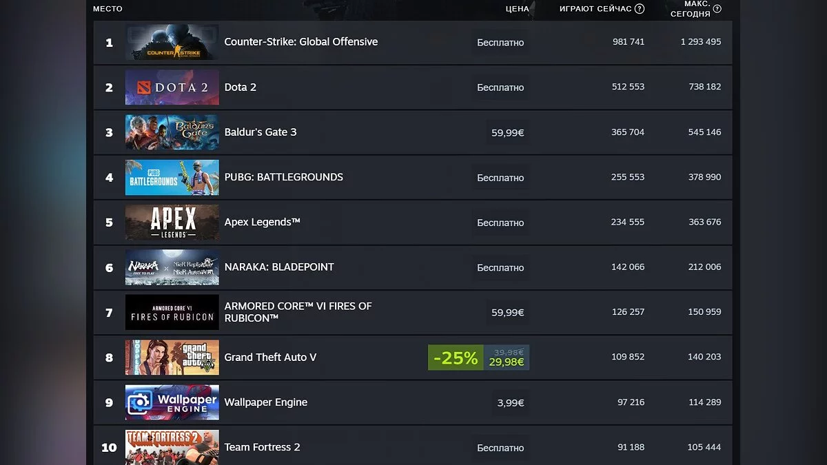 В первую тройку по-прежнему входят Counter-Strike: Global Offensive, Dota 2 и Baldur's Gate 3.