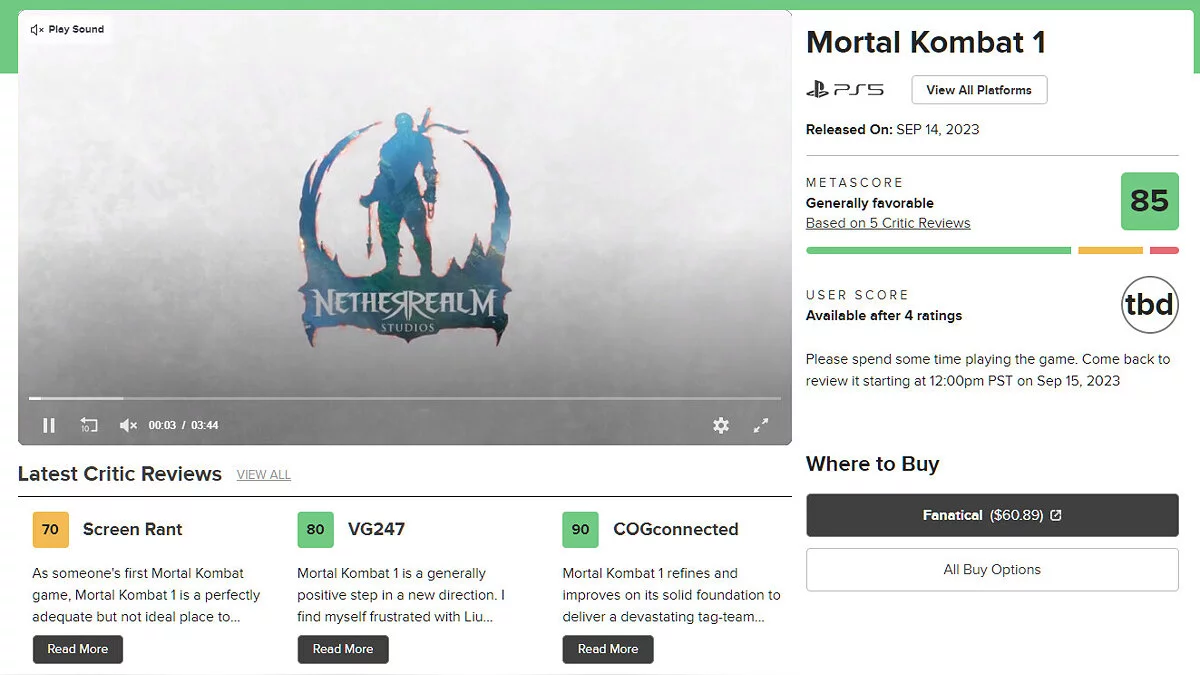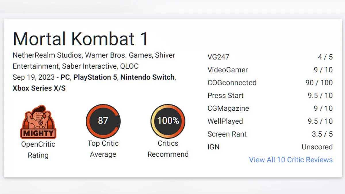В сети начали появляться первые обзоры Mortal Kombat 1. Как и ожидалось, оценки высокие: у игры 87 баллов на OpenCritic и 85 баллов на Metacritic.