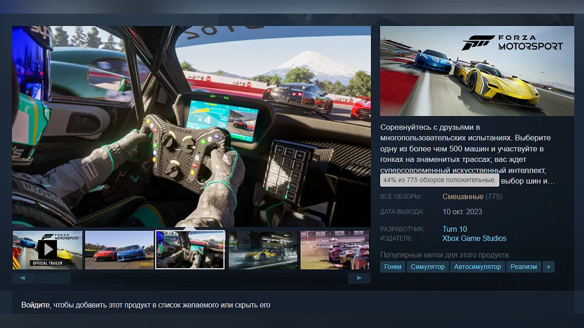 Вчера (10 октября) состоялся релиз гоночного симулятора Forza Motorsport, который уже успел получить первые отзывы от геймеров в Steam. Стоит заметить, что на момент написания новости проект имеет рейтинг 44%.