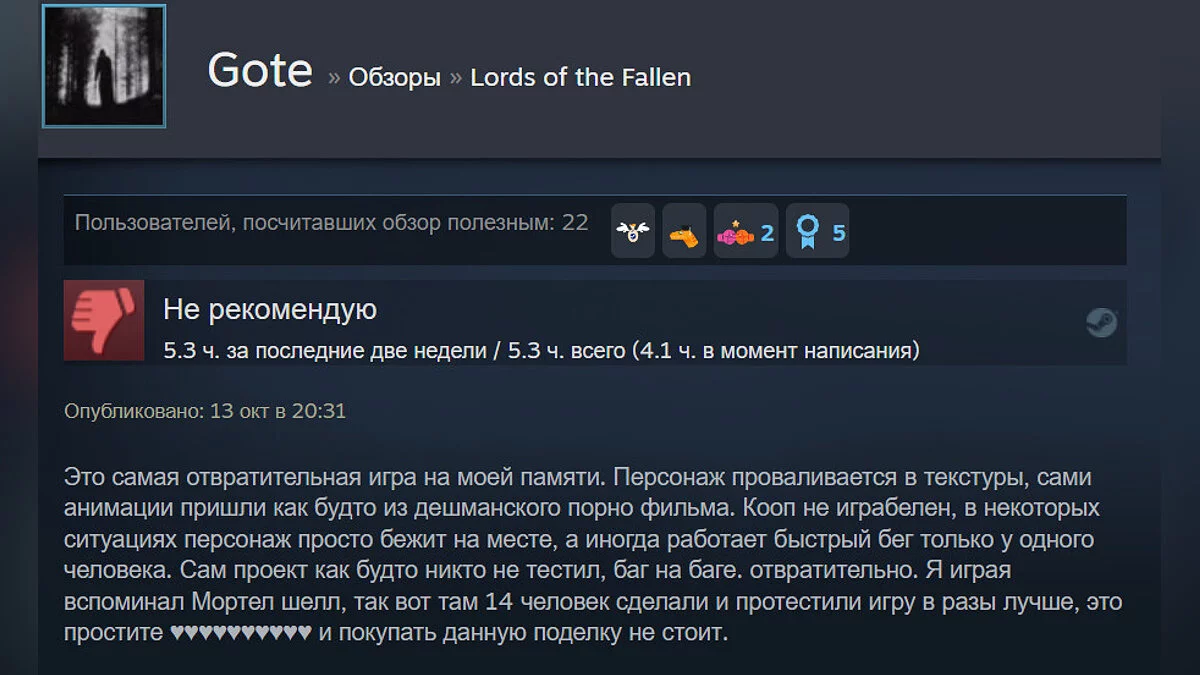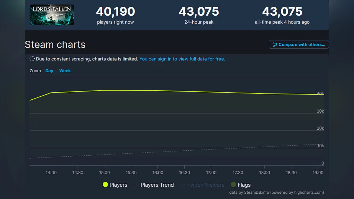 Несмотря на множество негативных отзывов и невысокие оценки критиков (средний балл игры на OpenCritic равен 75/100), Lords of the Fallen хорошо стартовала в Steam. Пик онлайна составил 43 тысячи человек. Недавно вышедший соулслайк Lies of P, который получил более высокие оценки игроков (89% положительных отзывов) и критиков (88/100 баллов на OpenCritic), стартовал в сервисе Valve в два раза хуже — в пике онлайна в проекте находились 19,6 тысяч геймеров.