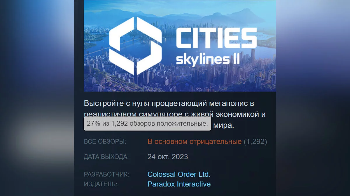 В Steam состоялся релиз градостроительного симулятора Cities: Skylines 2. Хотя игра оказалась очень популярной на старте (пик онлайна превысил 100 тысяч человек), запуск проекта был омрачён ужасной оптимизацией. На момент публикации новости рейтинг второй части составил всего 27%.
