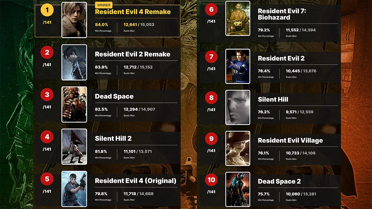 Примечательно, что 6 из 10 мест в первой десятке заняли игры серии Resident Evil. Также стоит отметить демку P.T., которая оказалась на 15 позиции — она обогнала Bloodborne, Silent Hill 3, Outlast, Left 4 Dead, System Shock 2, The Evil Within и многие другие известные ужастики.