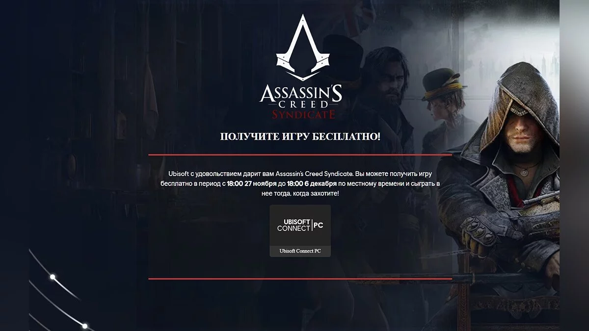 Ubisoft запустила бесплатную раздачу ПК-версии Assassin's Creed: Syndicate. Акция продлится до 6 декабря.