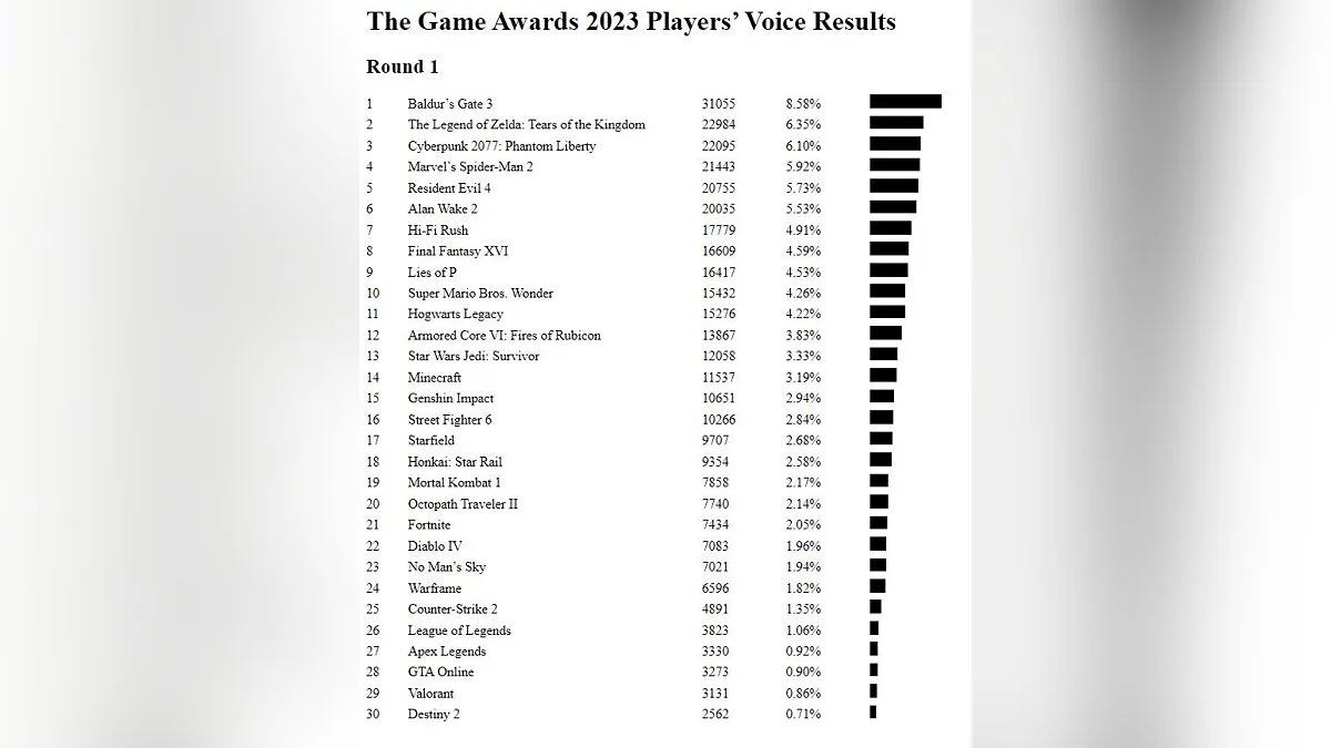 Вчера (27 ноября) на сайте The Game Awards стартовало голосование за лучшую игру в 2023 году. Однако несмотря на то, что оно скрытое, в коде страницы уже смогли обнаружить счетчик голосов, показывающий предварительные результаты.