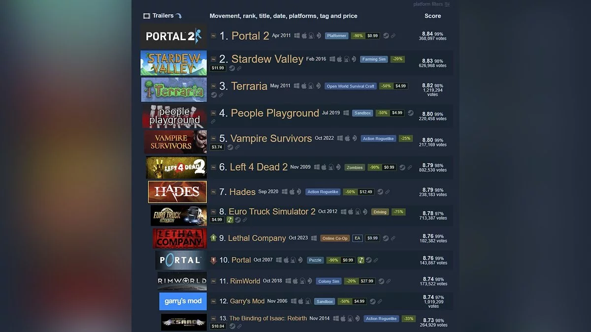 Тайтл от разработчика-одиночки обогнал таких мастодонтов, как CS2, Red Dead Redemption 2, Modern Warfare 3 и Cyberpunk 2077. Выше находятся лишь предзаказы на Steam Deck.