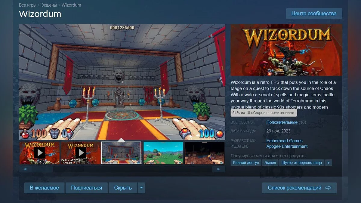 Компания-издатель Apogee Entertainment и студия-разработчик Emberheart Games выпустили в раннем доступе олдскульный шутер от первого лица под названием Wizordum. Первые отзывы — положительные.