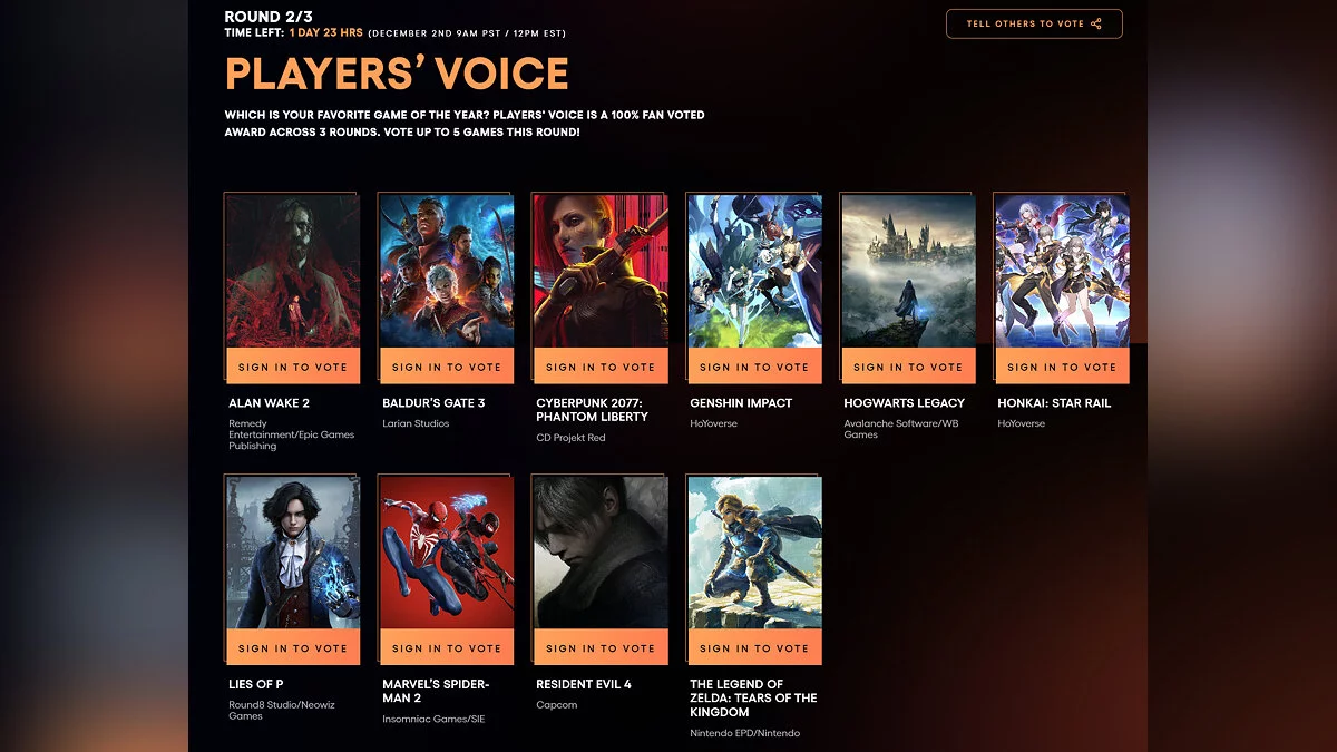 На сайте The Game Awards стартовал второй этап голосования за лучшую игру в 2023 году, который продлится 2 дня и закончится 2 декабря в 20:00 по московскому времени. В него прошли 10 проектов, включая Genshin Impact и Honkai: Star Rail. Во втором этапе геймеры могут проголосовать за 5 игр.