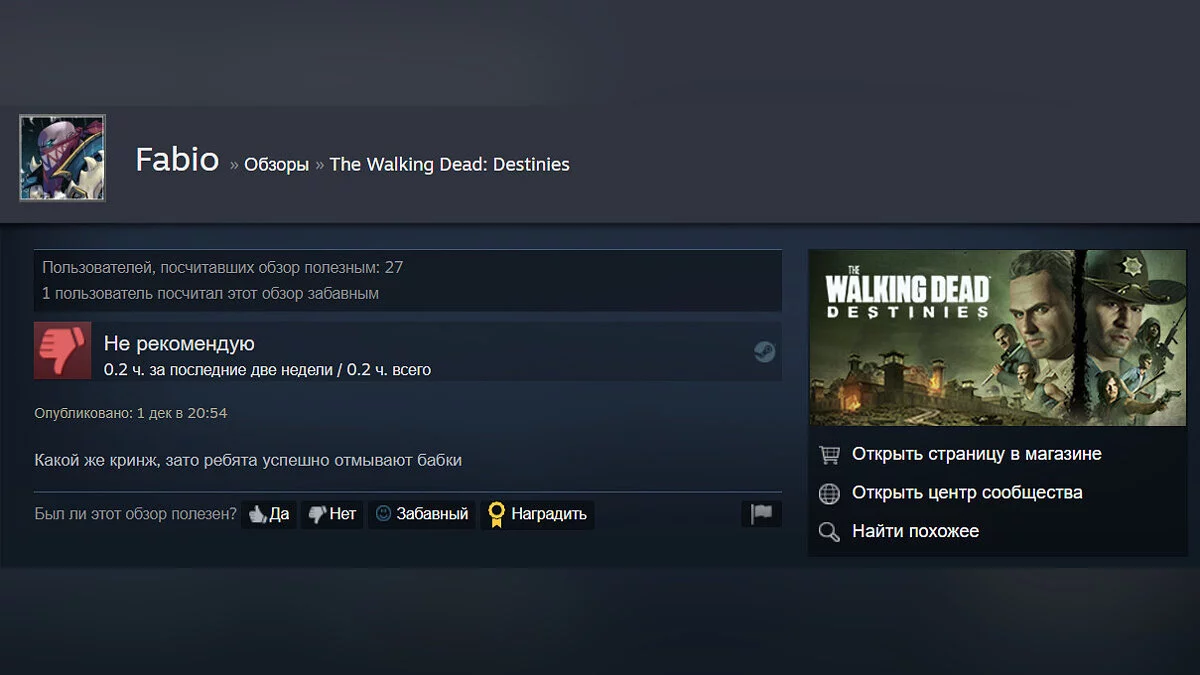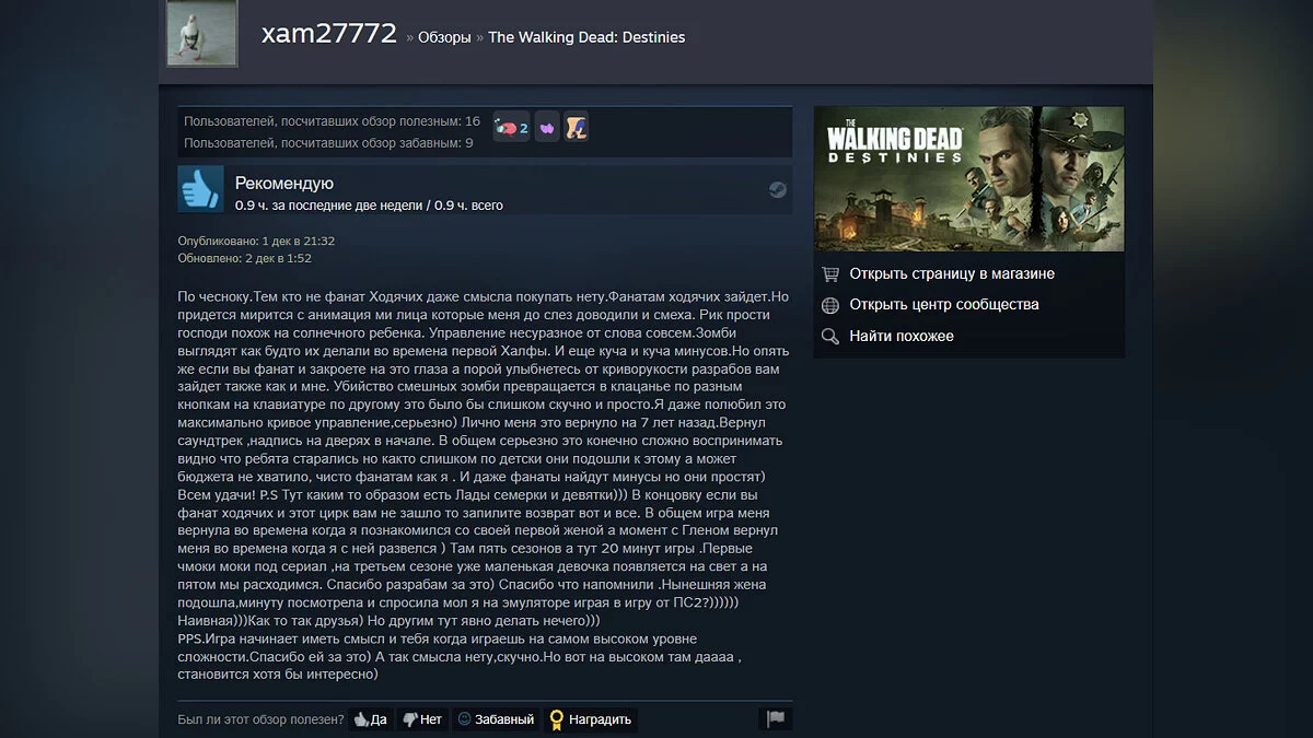 Купить The Walking Dead: Destinies в Steam можно за 1280 руб с учетом скидки 20% (действует до 15 декабря). Напомним, ранее состоялся консольный релиз, который также вызвал много отрицательных реакций.