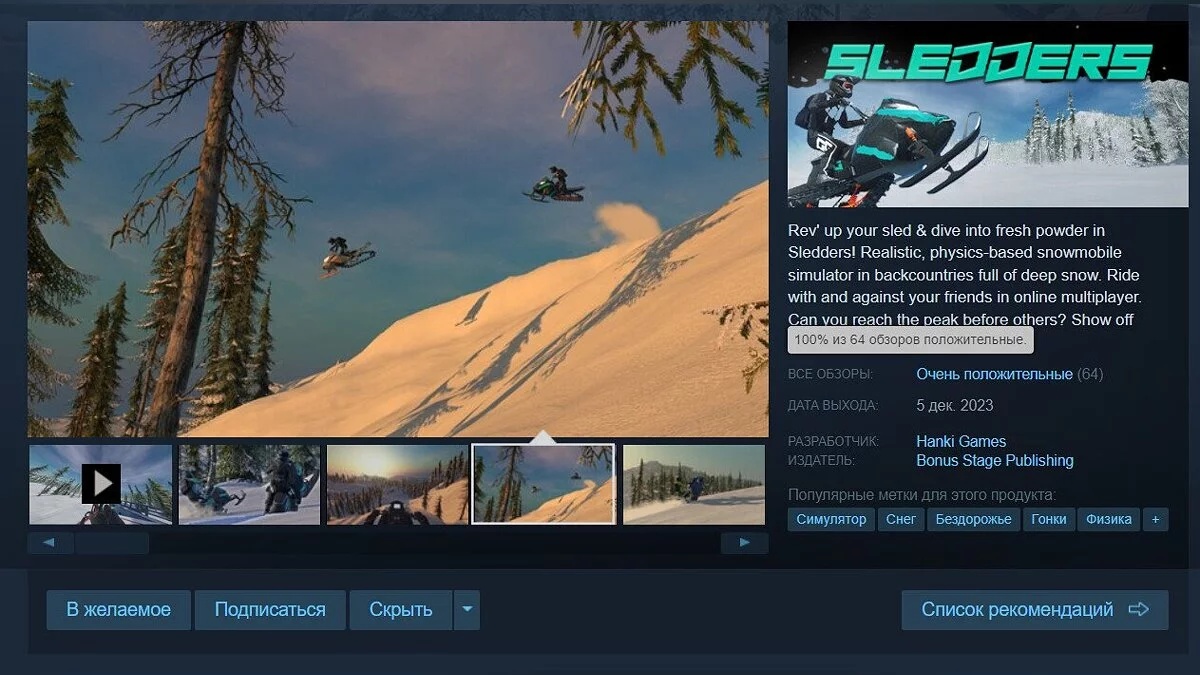 Компания Bonus Stage Publishing и студия Hanki Games выпустили в раннем доступе Steam гоночный симулятор снегохода Sledders, который в первый же день получил 100% положительных отзывов.
