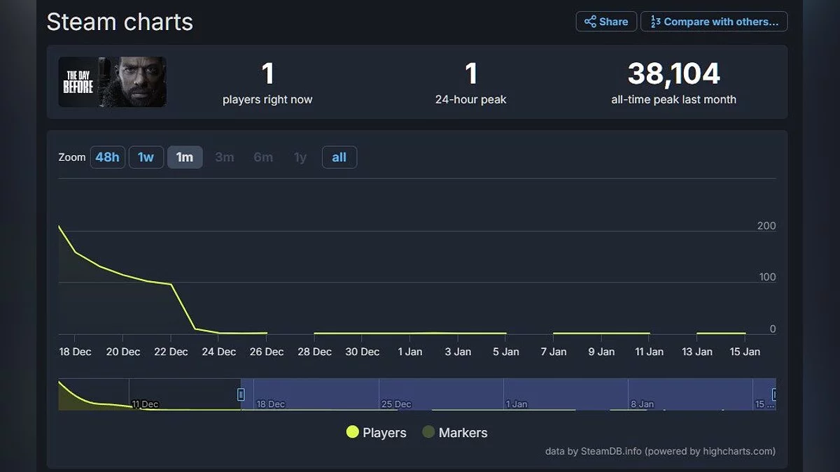 Несмотря на грандиозный провал The Day Before, у онлайн-игры остался как минимум один преданный поклонник. Согласно данным сервиса SteamDB, последние три недели суточный онлайн равняется единице.