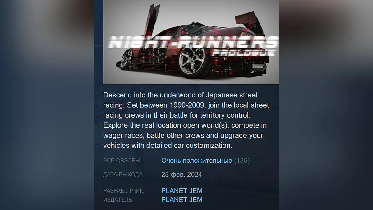 В сервисе Steam стала доступна бесплатная ранняя версия Night-Runners — игры про уличные гонки в Японии, где нужно соревноваться с бандами в битве за контроль над территорией.