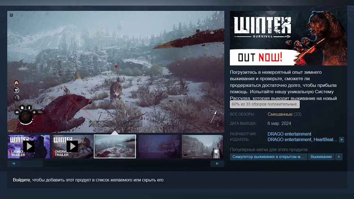 Компания Drago Entertainment выпустила в раннем доступе Steam новый симулятор выживания в открытом мире под названием Winter Survival. На момент написания новости игра получила смешанные отзывы (рейтинг 60%).