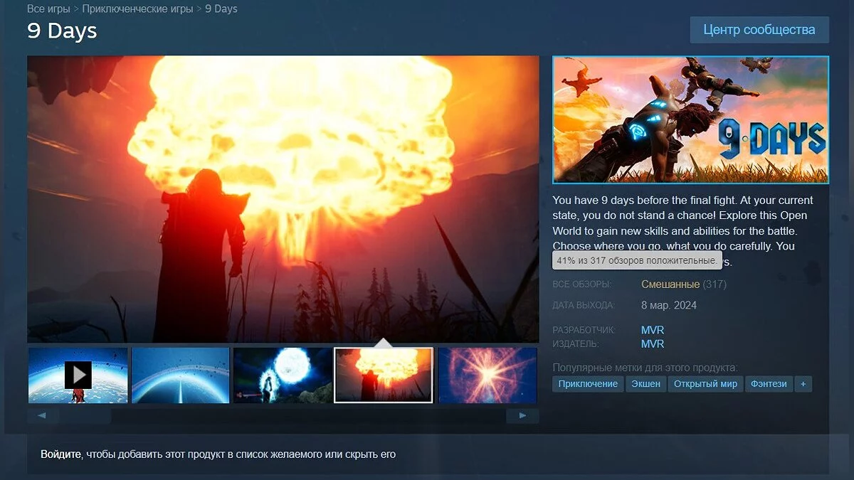 Студия MVR выпустила в Steam ролевой экшен от третьего лица с открытым миром под названием 9 Days. Первые отзывы от игроков — смешанные. На момент написания новости рейтинг игры составляет всего 41%.