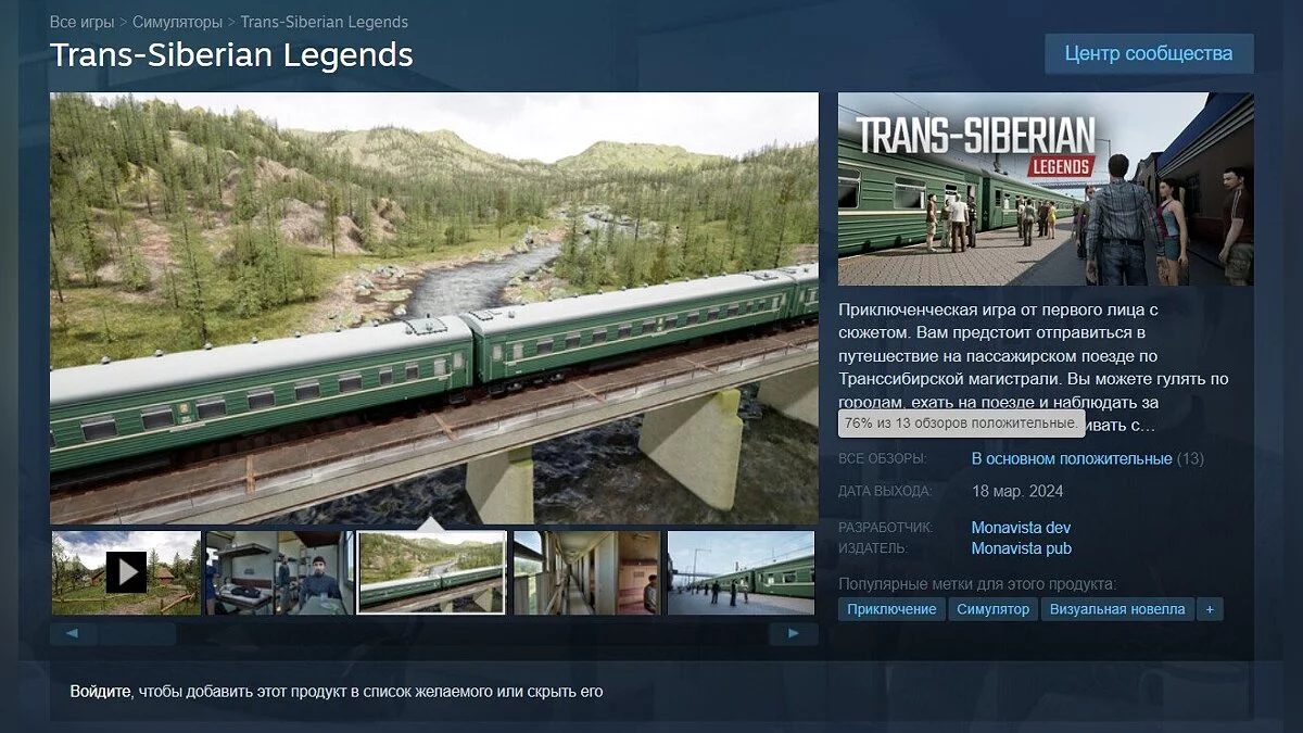 В Steam вышла приключенческая игра от первого лица с открытым миром Trans-Siberian Legends, в которой геймерам предстоит путешествовать по России на пассажирском поезде. На момент написания новости рейтинг проекта составляет 76%.