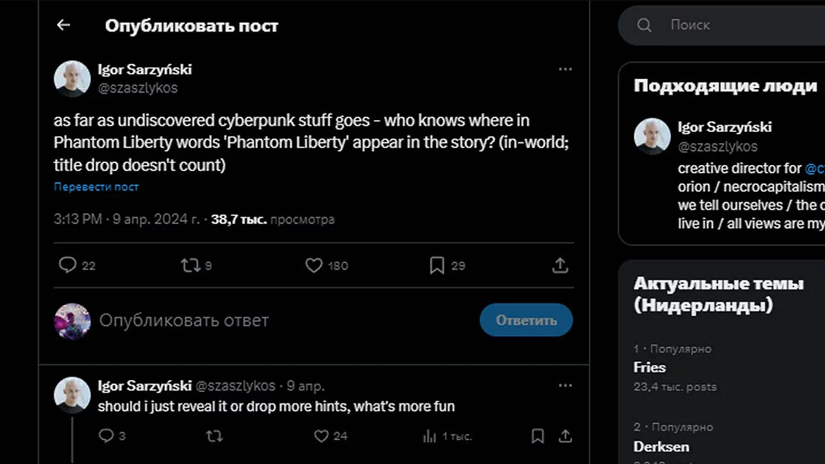 Все началось с поста креативного директора игры Игоря Сарзиньского (Igor Sarzyński), который написал следующее: