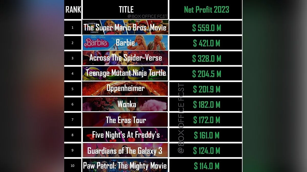 Второе место в списке заняла комедия «Барби» (421 млн долларов), а на третьем оказался анимационный фильм «Человек-паук: Паутина вселенных» (328 млн долларов). «Оппенгеймер» расположился на пятом месте, уступив четвёртую позицию «Черепашкам-ниндзя».