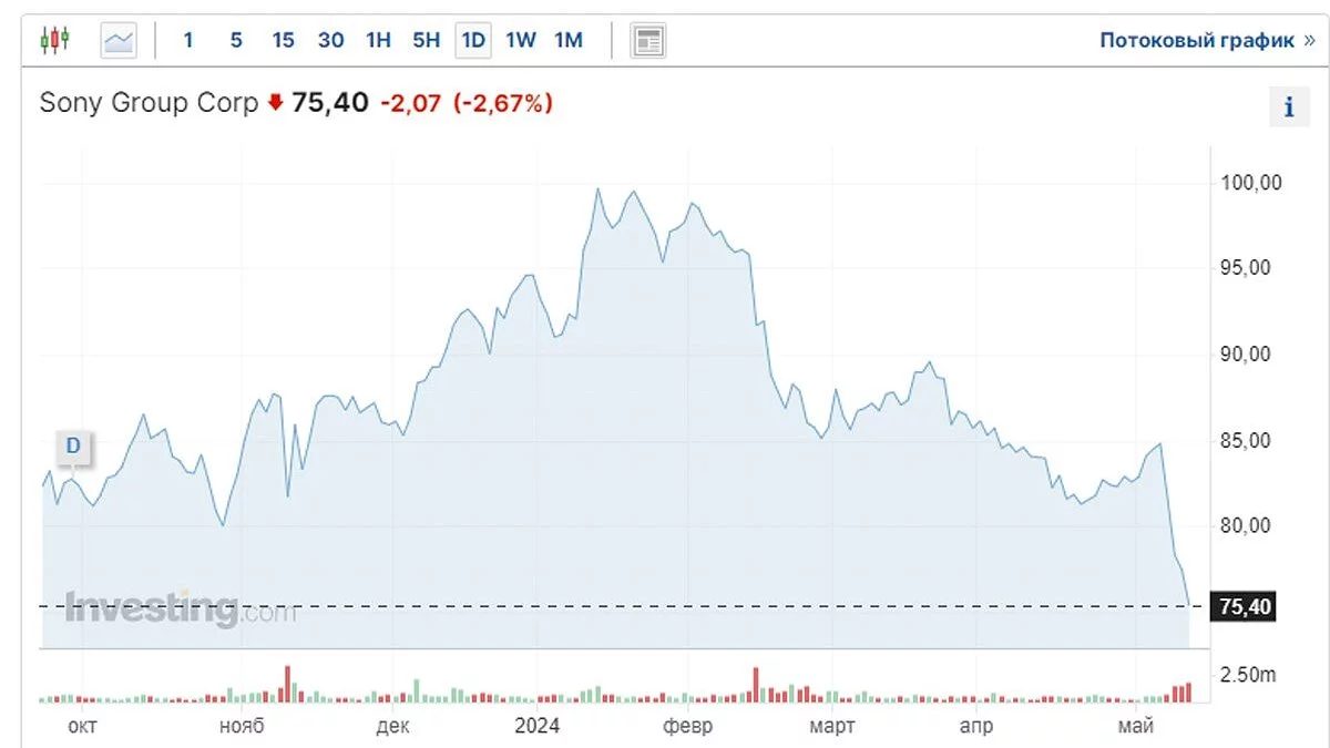 Судя по данным Investing.com, стоимость акций Sony начала стремительно снижаться после удаления игр издателя из Steam для регионов без PSN. Напомним, что 5 мая была изъята Helldivers 2, а вчера вечером то же самое постигло и ПК-версию Ghost of Tsushima.