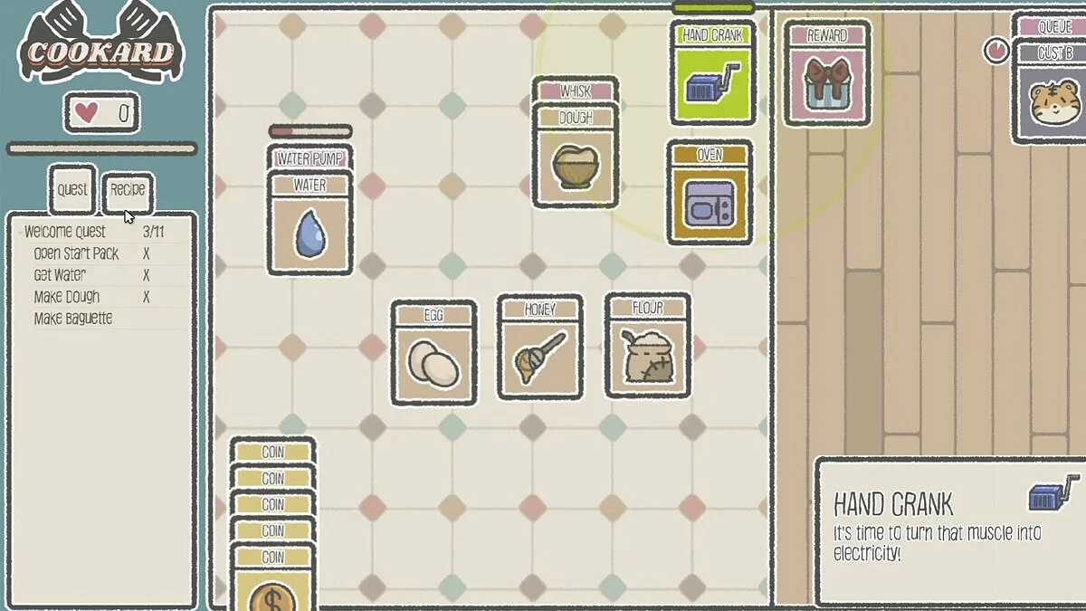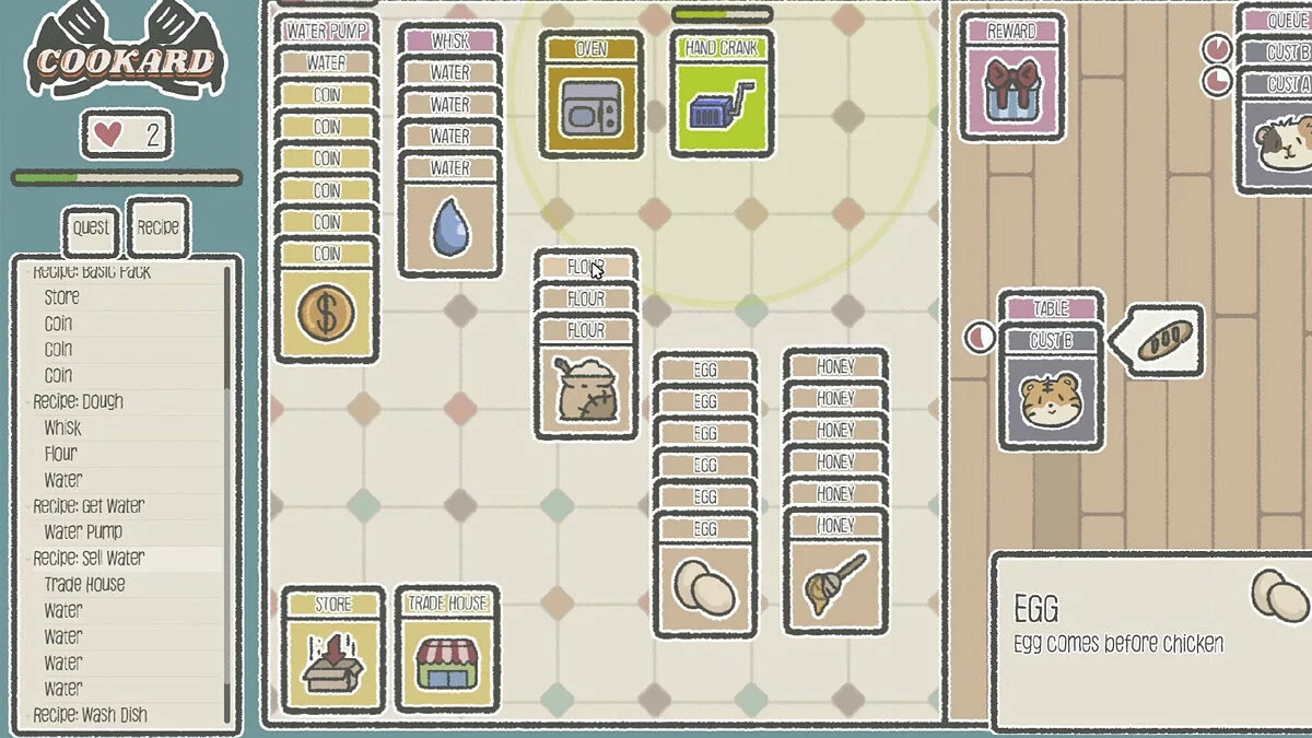 Cookard — карточная кулинарная игра, в которой нужно управлять своим рестораном и готовить блюда. По мере прогрессии открываются новые рецепты. Некоторые товары можно обменивать для улучшения магазина. Страница в Steam.