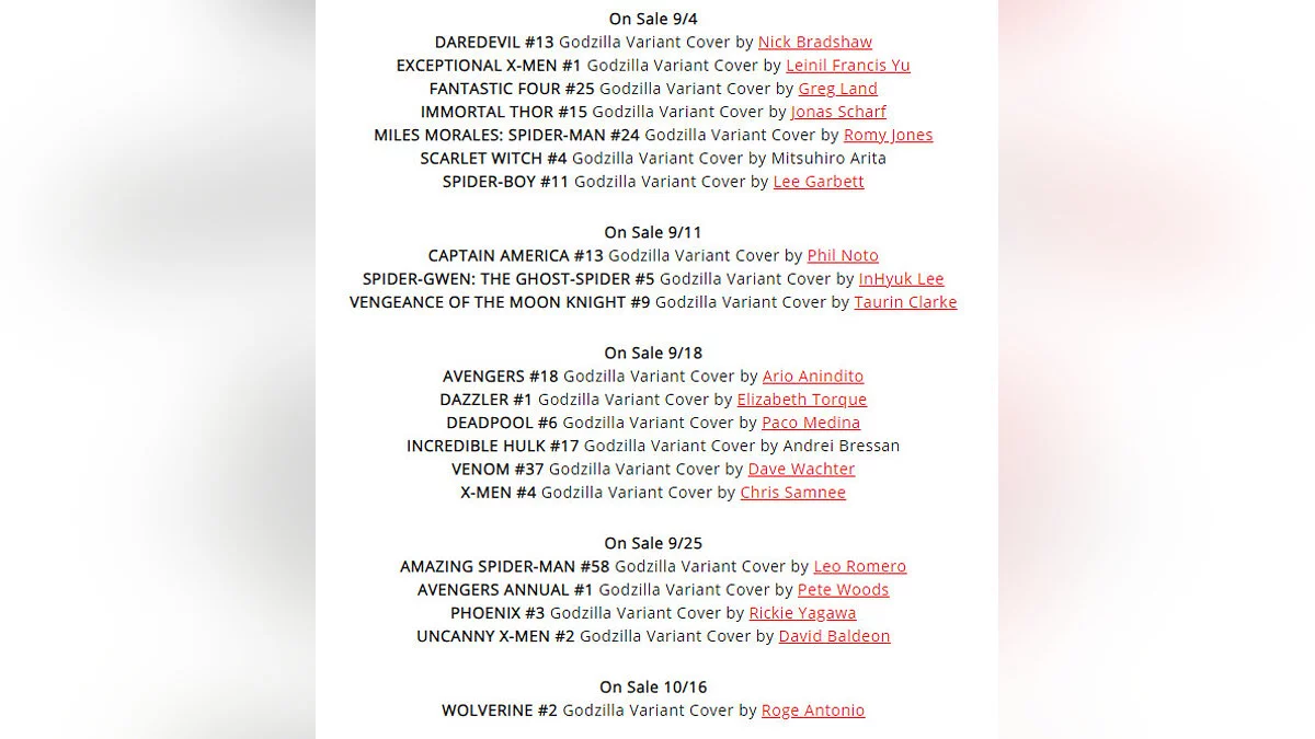 В рамках кроссовера Marvel подготовила специальные обложки с кайдзю для более чем 20 своих комиксов. Все они поступят в продажу осенью 2024 года. Полный список показан на изображении.
