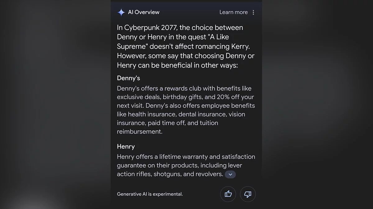 Мы уже рассказывали про нейросеть AI Overview от Google, которая напугала пользователей по всему миру откровенно вредными советами. На этот раз ИИ развеселил фанатов Cyberpunk 2077, предложив свое решение для одного из квестов.
