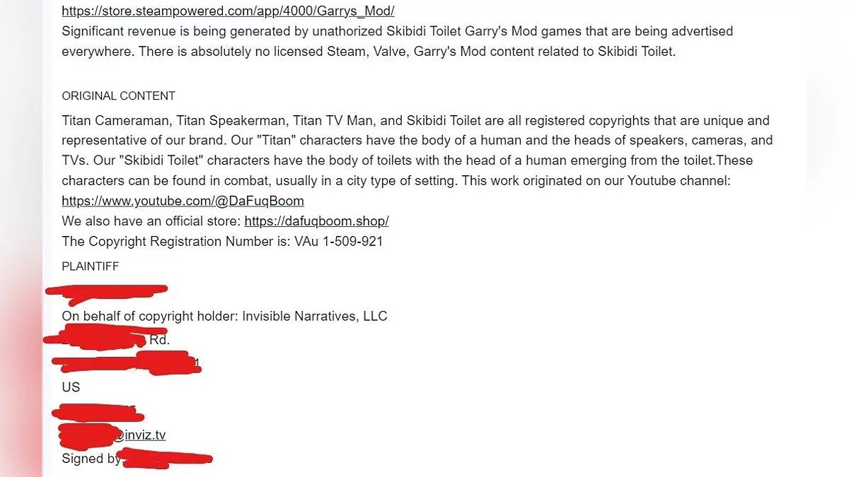 В жалобе сказано, что автор Garry's Mod использует ассеты, принадлежащие авторам «Скибиди-туалетов». При этом сериал создается в Source Filmmaker на основе моделей Valve, которая издает Garry's Mod. «Вы можете поверить в такую наглость?» — написал Ньюман у себя в Discord.