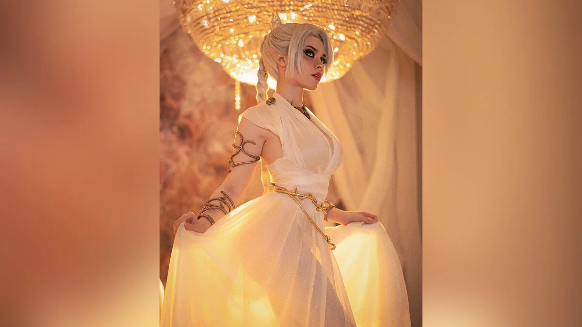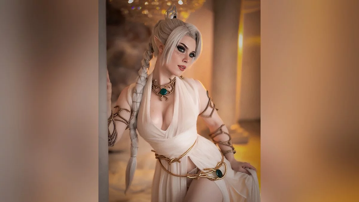 Модель приготовила два образа, которые можно встретить в игре. На первых фотографиях Илона позирует в элегантном белом платье, а на других ее можно увидеть в мантии матери волн. Напишите в комментариях, какой вариант вам понравился больше.