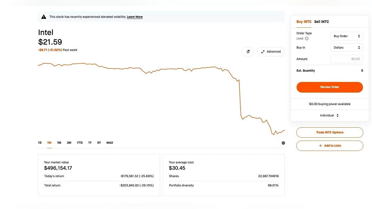 На Reddit завирусилась история парня, который приобрел акции Intel за $700 тысяч. Буквально спустя пару дней стоимость ценных бумаг обрушилась почти на 30% впервые за 50 лет существования компании, а реддитор остался ни с чем.