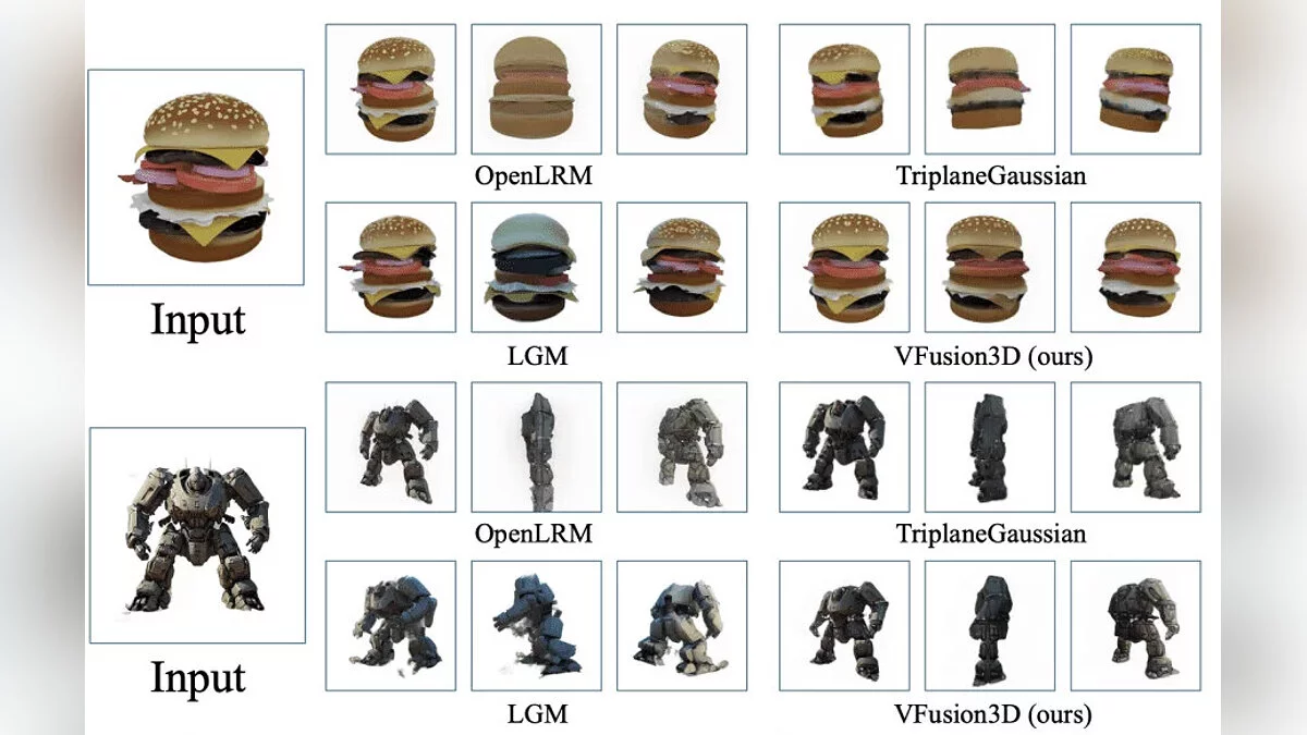 VFusion3D создает высококачественные трехмерные модели из одномерного изображения за счет множества настроек генерации. Она уже превосходит нейросети вроде OpenLRM и LGM и работает намного быстрее — хватает 17 секунд. Ниже можно посмотреть на некоторые примеры сгенерированных объектов: