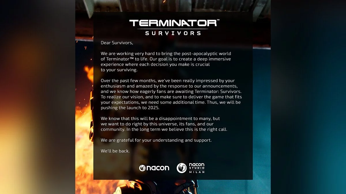 Студия Nacon Studio Milan объявила о переносе Terminator: Survivors, постапокалиптической выживалки с открытым миром по «Терминатору». Релиз отодвинули с 24 октября на 2025 год.