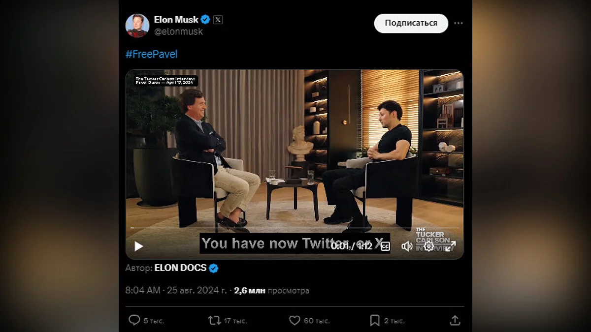Владелец соцсети X (Twitter) поделился у себя в профиле коротким отрывком из интервью Павла Дурова журналисту Такеру Карлсону (Tucker Carlson), сопроводив пост хэштегом #FreePavel.