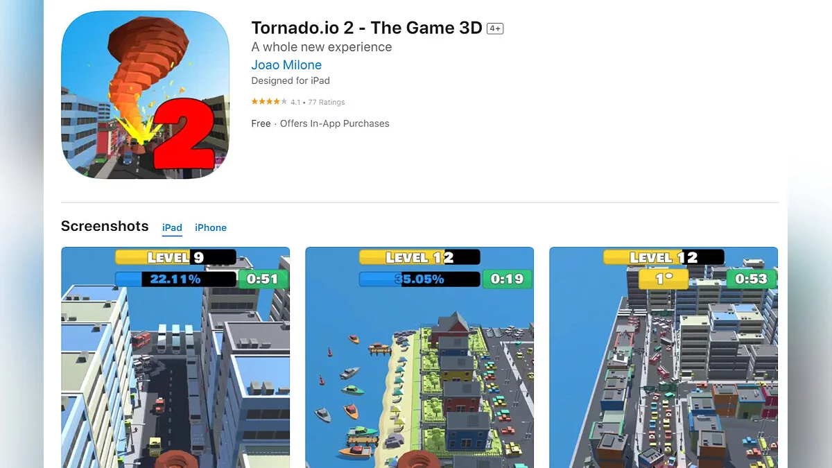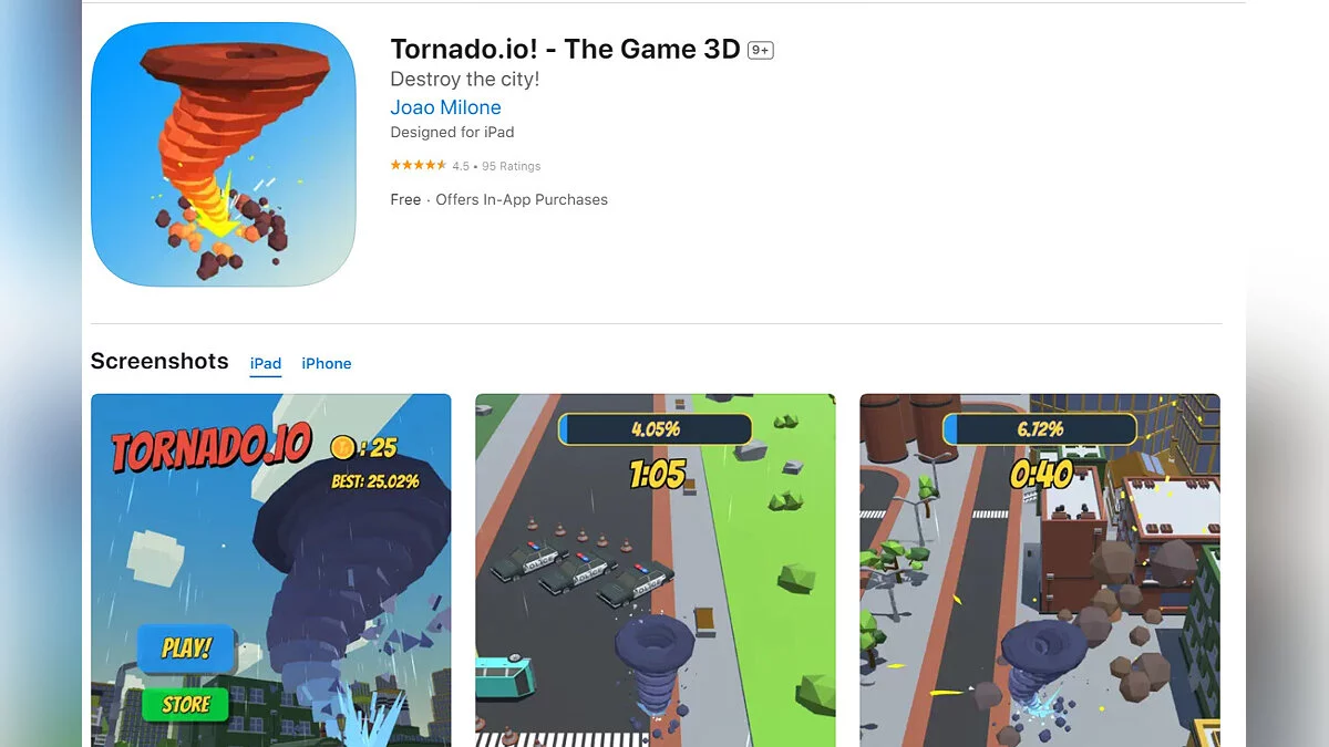 - Tornado.io! — The Game 3D — аркадна гра, в якій гравець може керувати торнадо, здатним знищувати людські міста (завантажити безкоштовно);