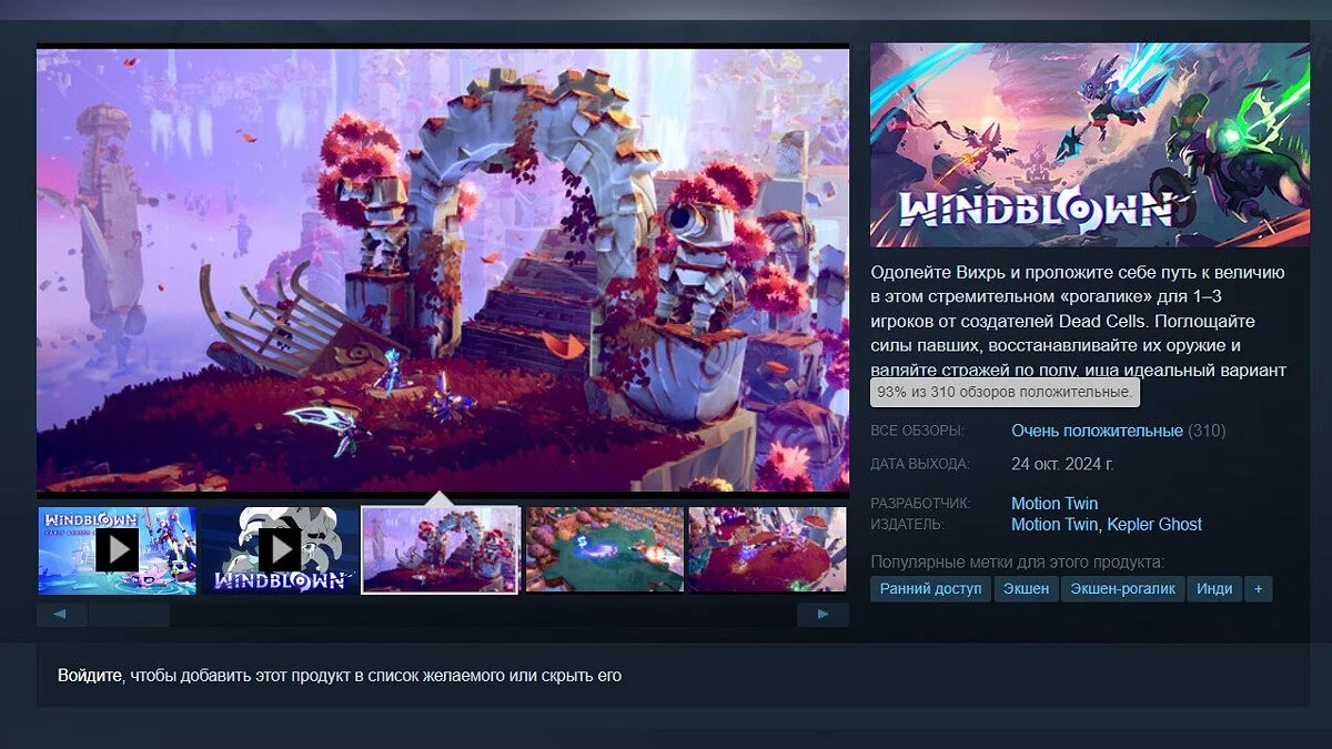 Студія Motion Twin (автори Dead Cells) випустила в ранньому доступі Steam свою нову гру під назвою Windblown. В Steam проєкт вже отримав 93% позитивних відгуків.
