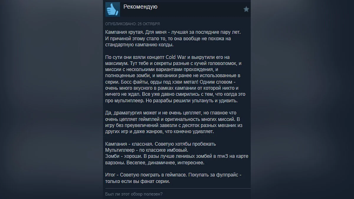 Геймери похвалили основну сюжетну кампанію шутера з варіативністю проходження, різними секретами та прокачкою бази, непоганий мультиплеєр, анімацію та стрільбу. Багато хто відзначив появу нових механік з інших ігор серії та навіть зовсім сторонніх проєктів, що різноманітило геймплей. Окремо гравці оцінили режим «Зомбі» — останній вийшов краще, ніж у Modern Warfare 3.