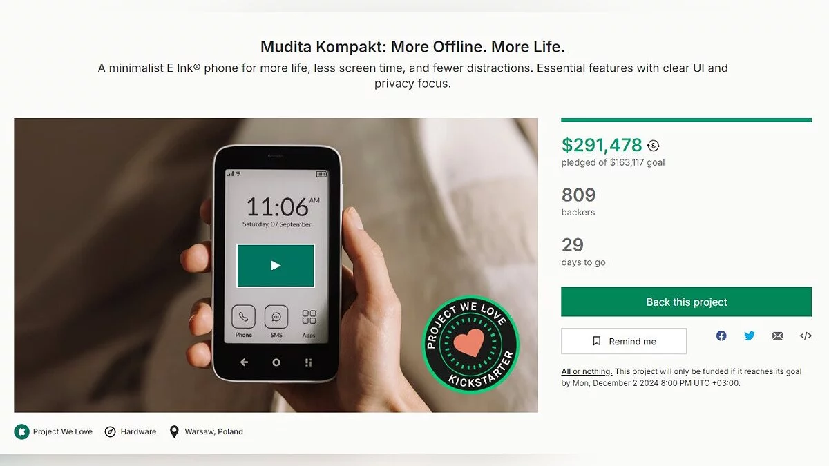 Компанія Mudita, створена співзасновником CD Projekt RED Міхалом Кічинським (Michal Kiciński), представила на Kickstarter чергову цікаву розробку. Цього разу нею став «філософський» міні-смартфон, який покликаний забезпечити конфіденційність.