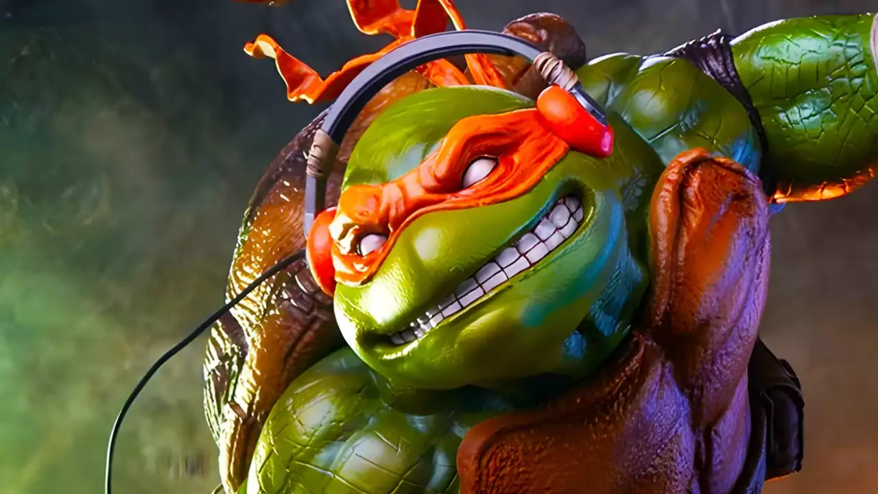 Показано круту колекційну фігурку Мікеланджело — Черепашка-ніндзя на скейті і з піцою в руках -