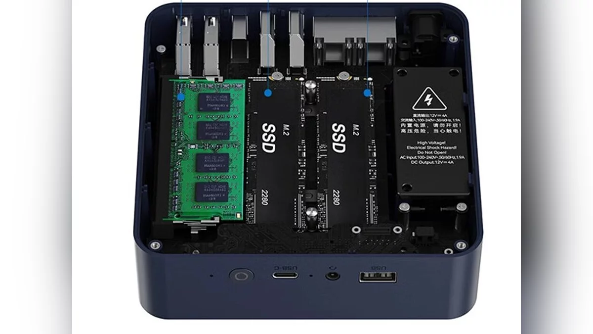Пристрій пропонує два слоти M.2 для встановлення NVMe SSD з підтримкою інтерфейсів PCI-e 4.0 та 3.0, а також один слот для оперативної пам'яті DDR4 SO-DIMM. Система охолодження базується на кулері, що забезпечує стабільну роботу при мінімальному шумі.