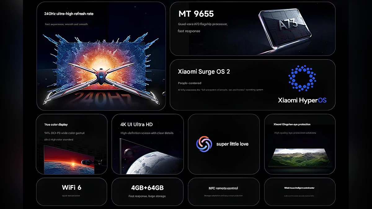 Телевізори мають покриття колірного простору DCI-P3 на рівні 94%, що гарантує точну передачу кольорів. Серія працює на потужному чотириядерному процесорі MediaTek MT9655 і має 4 Гб ОЗП і 64 Гб ПЗП. У поєднанні з системою HyperOS 2 та штучним інтелектом, нові моделі забезпечують високу швидкість відгуку та зручність управління.