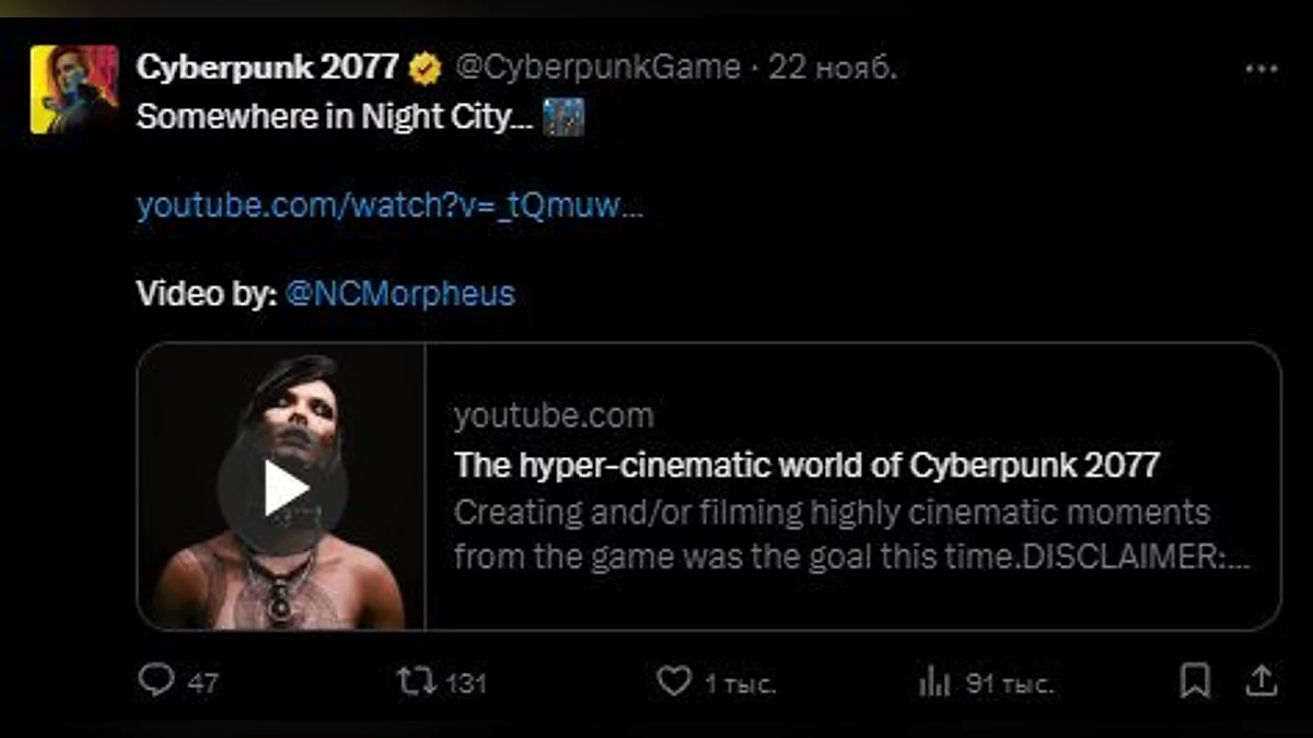 Творчість фаната оцінили і розробники з CD Projekt RED. Вони поділилися роликом в офіційному акаунті Cyberpunk 2077, показавши його своїм підписникам.