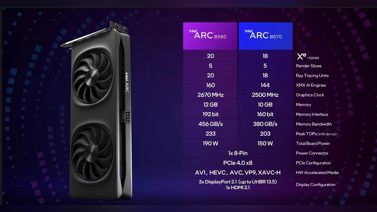 Arc B580 надійде в продаж 13 грудня 2024 року, а її ціна складе $249 (близько 26 000 рублів). Arc B570 вийде трохи пізніше — 16 січня 2025 року з цінником у $219 (близько 23 000 рублів). Окрім стандартної версії Arc B580, буде доступна ексклюзивна Limited Edition у фірмовому дизайні Intel, таким чином компанія прагне зміцнити позиції в середньому сегменті, пропонуючи користувачам поєднання актуальних технологій і привабливої ціни.