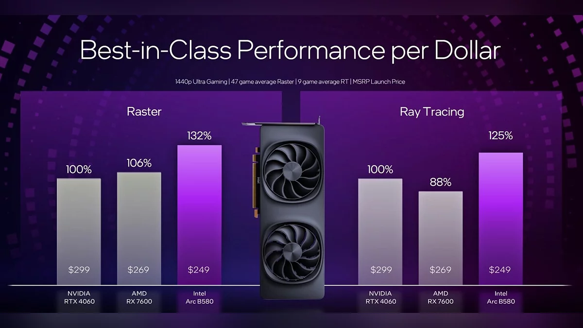 Intel стверджує, що старша модель Arc B580 є лідером у своєму класі за співвідношенням ціни і продуктивності. У тестах компанії відеокарта демонструє до 32% приросту швидкості порівняно з Nvidia GeForce RTX 4060, а при трасуванні променів виграє до 25%. Додатковий приріст продуктивності забезпечить технологія масштабування Intel XeSS, яка покращує якість зображення при зниженні навантаження на GPU.