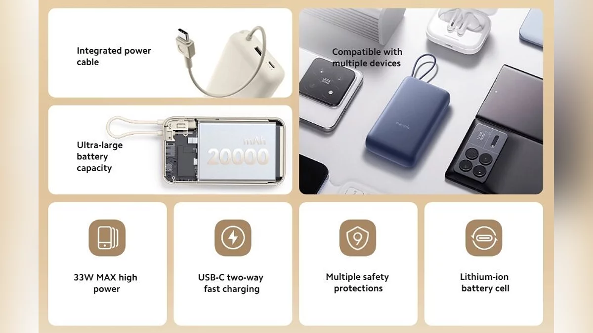 Xiaomi випустила на міжнародний ринок новий павербанк ємністю 20 000 мА*год, що привертає увагу компактним дизайном і рядом практичних функцій. Серед ключових особливостей аксесуара — вбудований кабель USB Type-C, який спрощує використання і дозволяє обійтися без додаткових проводів.