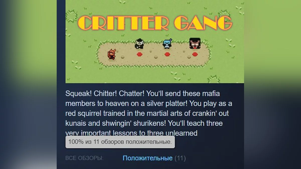 Critter Gang — хардкорний 2D-платформер про навчений бойовим мистецтвам рудий білку, яка вступила в боротьбу з мафією. Гра складається з трьох рівнів з босами. Сторінка в Steam.