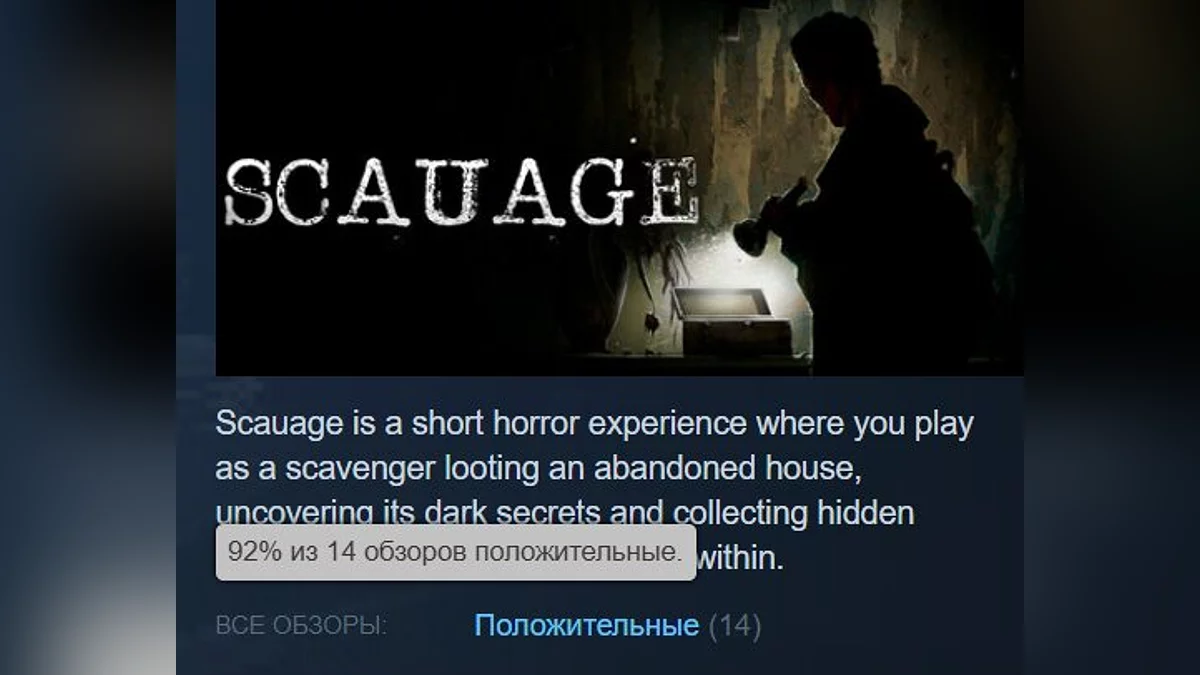 Scauage — короткий хорор про сміттяря, який пробрався в старий двоповерховий будинок у занедбаному місті, що зберігає похмурі секрети. Сторінка в Steam.