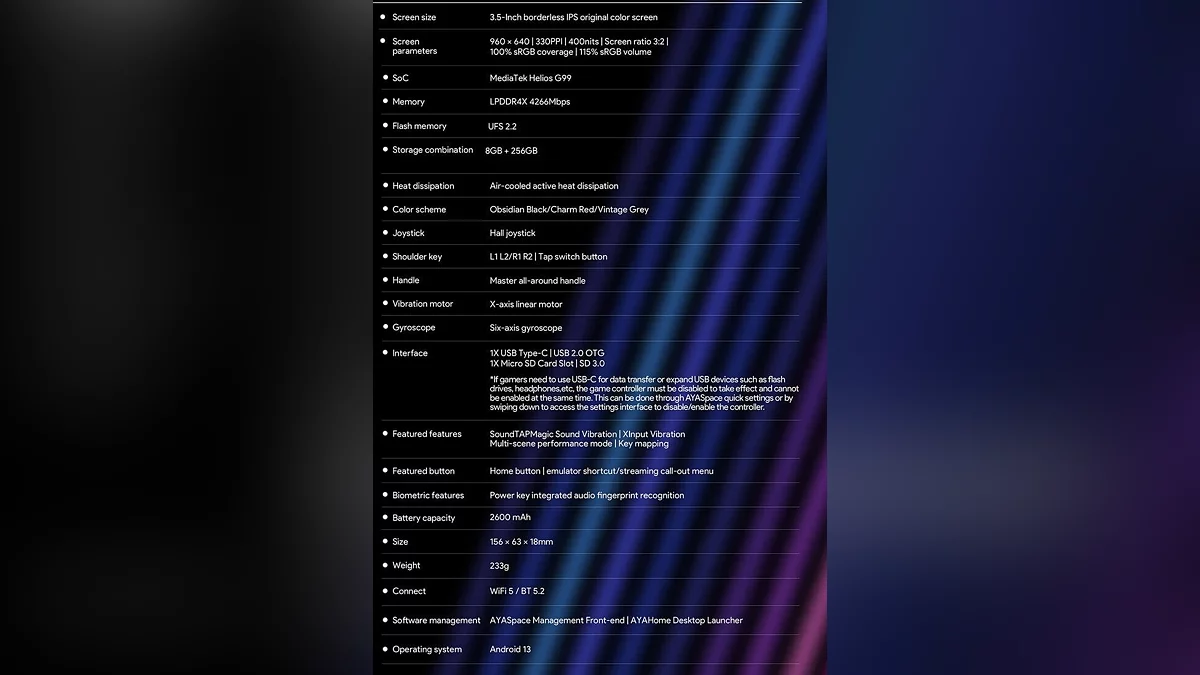 Пристрій підтримує Wi-Fi 5 і Bluetooth 5.2, а також оснащений датчиками Холла для стиків, сканером відбитків пальців і шестивісним гіроскопом, що робить управління іграми ще більш зручним. Акумулятор ємністю 2 600 мА*год забезпечує 6–8 годин роботи в залежності від інтенсивності використання.