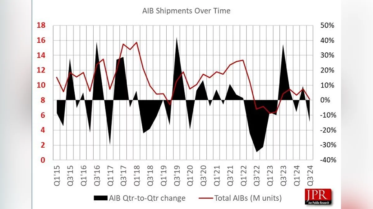 В третьому кварталі 2024 року поставки дискретних відеокарт зменшилися на 14,5 % порівняно з попереднім кварталом і на 7,9 % відносно аналогічного періоду 2023 року. Аналітичне агентство Jon Peddie Research (JPR) пов'язує цей спад з очікуванням нового покоління відеокарт GeForce RTX 5000 від Nvidia та оновлень від AMD, які можуть бути анонсовані в січні 2025 року.