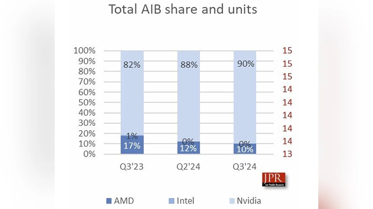 На фоні загальної стагнації Nvidia продовжує посилювати своє домінування. Її частка на ринку відеокарт збільшилася з 88 % до 90 %, тоді як AMD втратила 2 %, опустившись до 10 %. Intel, незважаючи на зусилля, залишилася з часткою в 0 %. Експерти також відзначають вплив зростаючої потужності інтегрованих графічних рішень та високих цін на дискретні GPU. Споживачі все частіше віддають перевагу дочекатися виходу нового покоління замість придбання застарілих моделей.