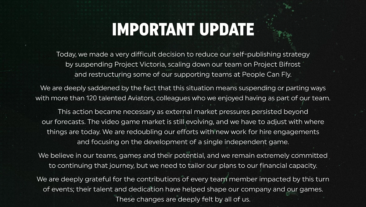 Генеральний директор People Can Fly Себастьян Войцеховскі повідомив у своєму блозі, що звільнення стали результатом змін у стратегії компанії, включаючи призупинення розробки Victoria, скорочення команди Bifrost та реструктуризацію допоміжних відділів.
