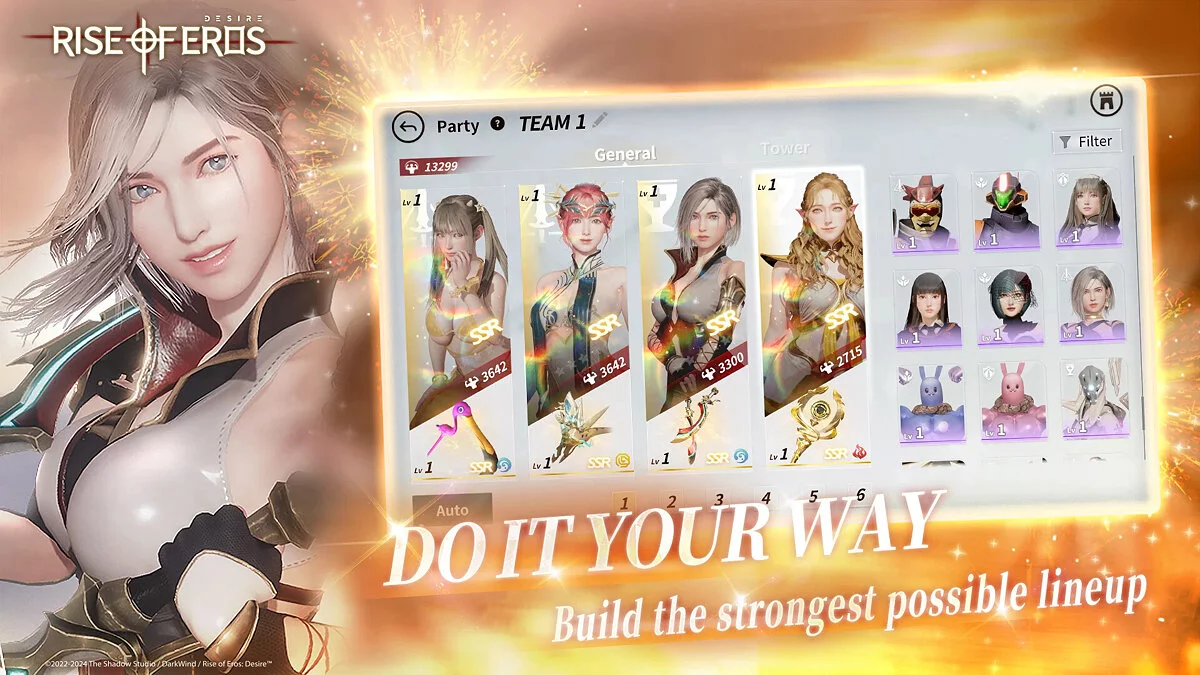 В плані геймплею Rise of Eros нагадує RAID: Shadow Legends. Гравці повинні брати участь у боях у форматі «команда на команду» і прокачувати персонажів, яких можна отримати з своєрідних «лутбоксів». У грі є сюжетна кампанія, в якій зараз доступно більше 15 глав, випробування, де можна заробляти різні ресурси для прокачки героїнь, битви з босами, вежа боїв і не тільки. Проект регулярно отримує оновлення з новими персонажами та івентами. Нещодавно автори запустили новорічну подію і додали трьох героїнь.
